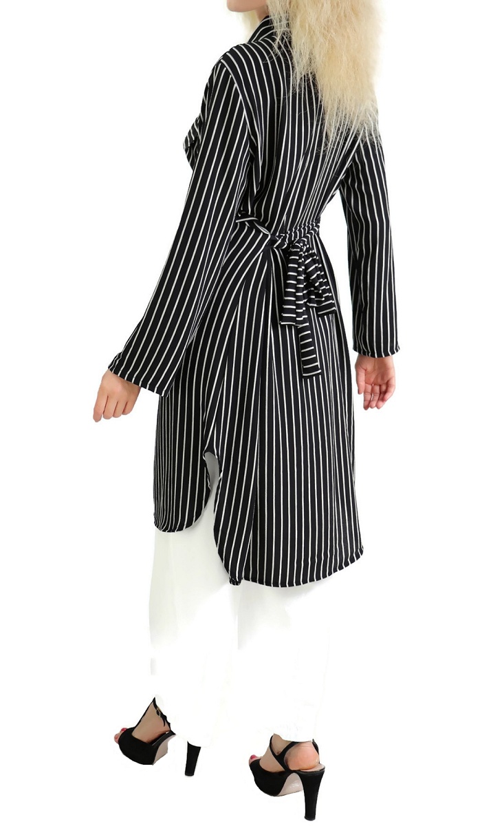 Chemise longue, manches ajustables, fermeture boutons, deux fausses poches plaquées, ceinture assortie, tissu effet crêpe, coupe droite.