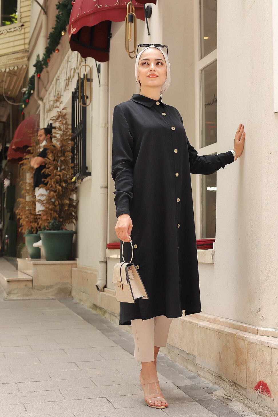 Longue chemise, fermeture boutonnée, col chemise, manches longues finition bouton. Coupe droite, tissu effet tissé, fluide frais et opaque.
