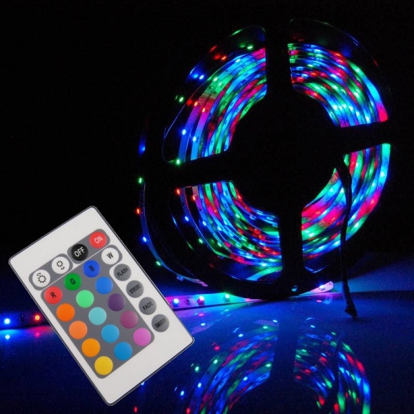 Eclairage LED ruban de 5 metres multicouleurs pour fetes, vitrines ou decorations (fourni avec transfo et sa telecommande)
