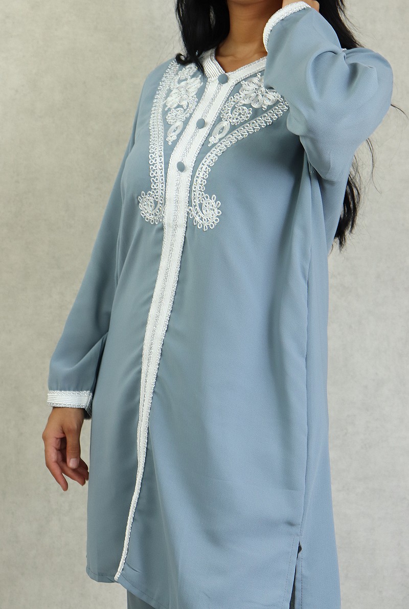 Jabador femme composé d’une tunique avec broderies sur le buste et sur les manches, et son pantalon assorti avec ceinture élastique, deux poches latérales, coupe droite.