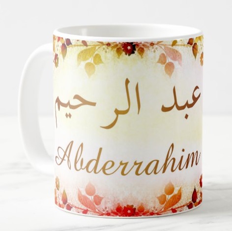 Mug avec le prénom "Abderrahim" écrit en français, en arabe (عبد الرحيم) et calligraphié de façon artistique en arabe sur la partie droite.