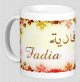 Mug avec le prénom "Albertine" écrit en français, en arabe (ألبرتين) et calligraphié de façon artistique en arabe sur la partie droite.