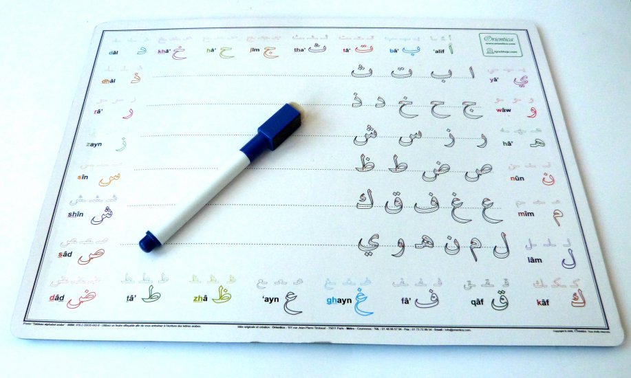 Sur une face, un puzzle de 28 pièces avec l'alphabet arabe, sur l'autre face, une ardoise avec feutre effaçable (utilisable à volonté).