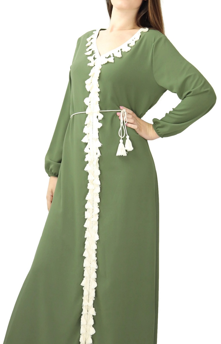 Robe longue, col en V, manches finition élastiques, ceinture à passants ajustable, entièrement doublée, coupe droite.